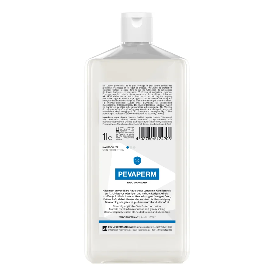 Die PEVAPERM Hautschutz-Lotion schützt vor wässrigen und nicht wässrigen Arbeitsstoffen wie zum Beispiel Kühlschmierstoffe, wässrige Lösungen, Öle, Fette, Teer, Bitumen, Farben, Ruß, Pigmente, Zement, Kalk, diverse Klebstoffe, PU-Schäume, Abdichtungsmaterialien, etc. Besonders bei wechselnden Hautbelastungen durch unterschiedliche Arbeitsstoffe wird die Haut hervorragend geschützt. Durch die Lotion wird der Hautkontakt durch schädliche Noxen und das tiefere Eindringen von Verschmutzungen in die Haut vermindert. Somit wird die allgemeine Hautbelastung reduziert und die anschließende Hautreinigung erleichtert.